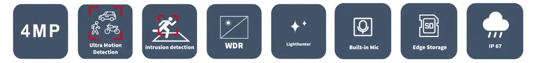Análisis de video basado en Inteligencia artificial, el dispositivo es capaz de activar Cruce de línea o Intrusión utilizando el algoritmo de UNV capaz de detectar siluetas humanas, vehículos motorizados y no motorizados para reducir falsas alarmas.