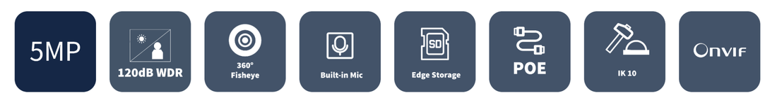 IPC815SB-ADF14K-I0, Cámara IP FISHEYE 360° 5MP, Lente 1.4mm, WDR 120dB, IR 10m, Micrófonos, alarma y audio 1in 1out, NDAA, IK10, IP66, serie PRIME I, Ultra 265, POE-af ó 12Vcc